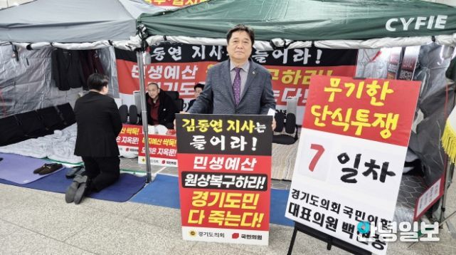 김호겸 의원은 먼저 백현종 경기도의회 의회 국민의힘 대표의원의 고뇌에 찬 단식투쟁 결단에 존경의 마음을 담아 응원하면서, “현재 경기도의회 1층 경기도 민생예산 복구 촉구 현장은 경기도의회 전체 구성원이 김동연 경기도지사에 대하여 민생을 위한 도정 이행을 촉구하는 것이다”라고 목소리를 높였다.