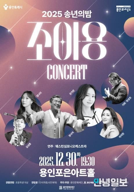 안녕일보 배윤 기자 | 용인문화재단은 오는 12월 30일 용인포은아트홀에서 지역예술인과 함께하는 ‘2025년 송년의 밤 - 조아용 콘서트‘를 용인예총(한국예총 용인지회)과 공동 개최한다.