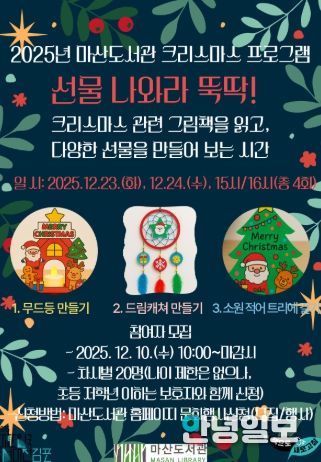 안녕일보 배윤 기자 | 김포시 마산도서관은 오는 12월 23일과 24일 이틀에 거쳐 크리스마스를 기념한 체험프로그램 ‘선물 나와라 뚝딱!’이 진행된다.