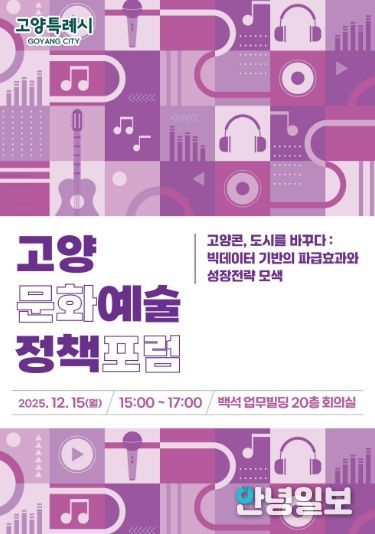 시 관계자는 “이번 포럼은 고양시 공연도시 전략의 다음 단계를 함께 설계하는 자리로, 전문가와 시민 모두에게 열린 논의의 장이 될 것”이라며“고양시의 성장에 관심 있는 시민과 음악·공연산업 관계자, 연구자 누구나 자유롭게 참여하기 바란다”라고 독려했다.