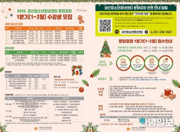 안녕일보 배윤 기자 | 수원시청소년청년재단 권선청소년청년센터는 오는 1월 6일부터 3월 27일까지 지역사회 평생학습 문화강좌 1분기(1~3월) 수강생을 모집한다.