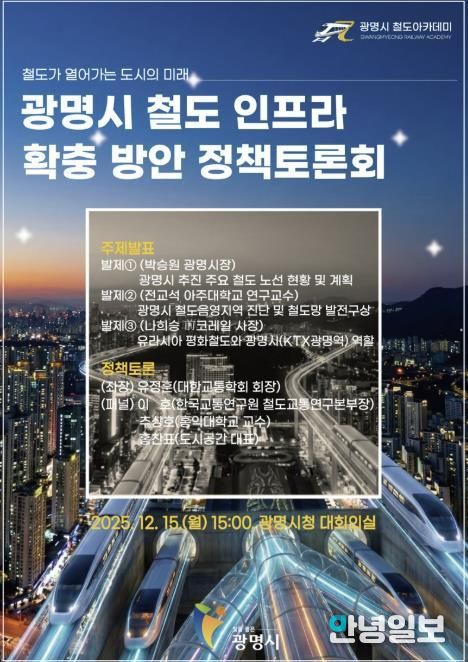 시는 오는 15일 오후 3시 시청 대회의실에서 ‘광명시 철도 인프라 확충방안 정책 토론회’를 개최한다.