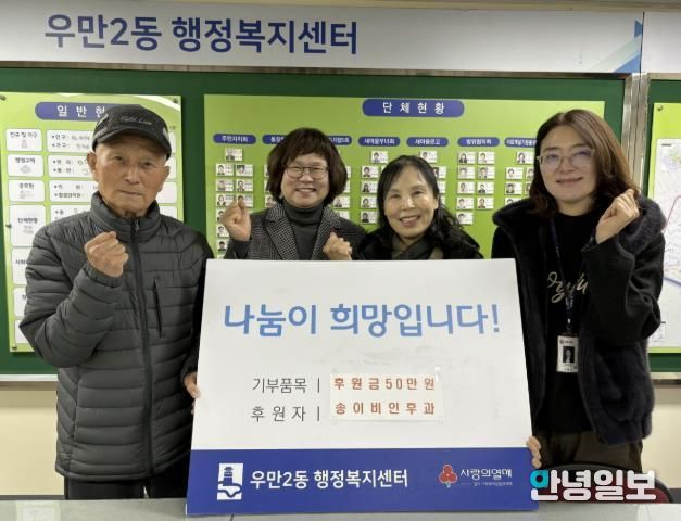 최영문 우만2동장은 “이 후원금은 금액 이상의 의미를 지니며, 힘든 시간을 보내고 있는 이웃들에게 큰 용기가 되고 있다”며 “후원자의 따뜻한 마음이 헛되지 않도록 도움이 필요한 분들을 위해 정성껏 활용하겠다”고 말했다.