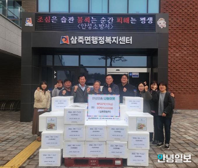 엄기헌 삼죽면장은 “노인복지에 관심을 가지고 이웃사랑을 실천해주시는 삼죽면한돈회 회장님과 회원분들께 깊이 감사드린다”며, “이런 꾸준한 나눔이 어르신들에게 큰 힘이 되고 있으며, 삼죽면도 민·관이 함께하는 따뜻한 복지 공동체를 만들기 위해 더욱 촘촘한 지원 체계를 마련하겠다”고 전했다.