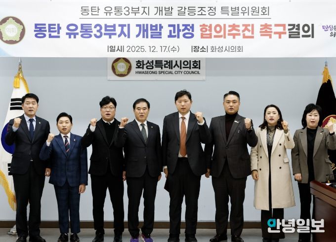 안녕일보 배윤 기자 | 화성특례시의회 '동탄 유통3부지 개발 갈등조정 특별위원회'는 17일 의회 대회의실에서 동탄 유통3부지 개발과정 협의추진 촉구결의를 진행했다.