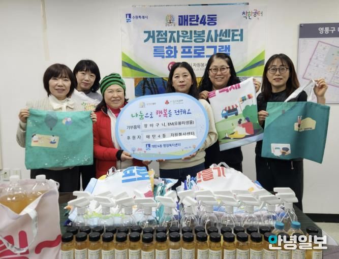 안녕일보 배윤 기자 | 수원시 매탄4동 자원봉사캠프 코치와 봉사회원들은 지난 12월 19일, 지역 상권 활성화와 마을 공동체 활성화를 위해 회원들이 직접 만든 장바구니와 EM(유용 미생물)을 매탄4동 행정복지센터에 전달했다.