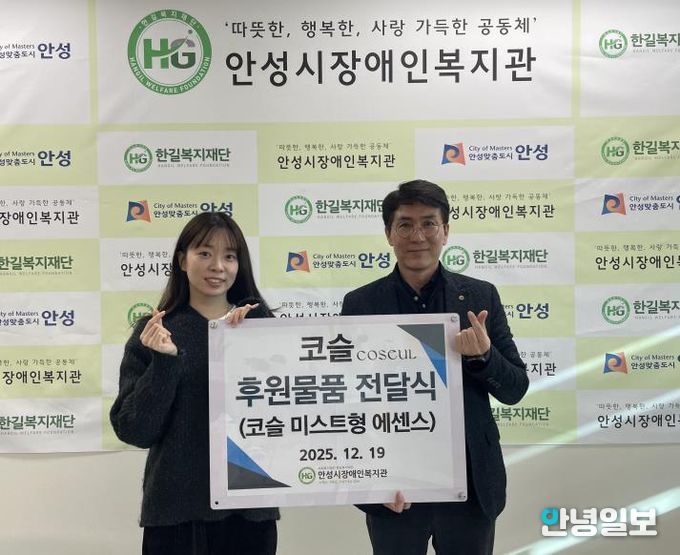 안녕일보 배윤 기자 | 사회복지법인 한길복지재단에서 수탁하고 있는 안성시장애인복지관은 지난 12월 16일, 코스메틱 브랜드 코슬(COSEUL)로부터 미스트형 에센스 50개(약 2,900,000원 상당)를 기부받았다고 밝혔다.