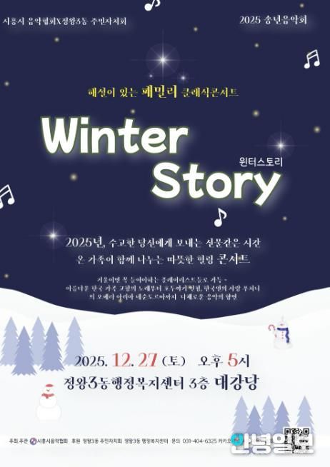 안녕일보 배윤 기자 | 시흥시음악협회는 정왕3동 주민자치회와 협력해 오는 12월 27일 오후 5시, 정왕3동 행정복지센터 3층 대강당에서 2025 송년 음악회 ‘해설이 있는 패밀리 클래식 콘서트, 윈터 스토리’를 개최한다.