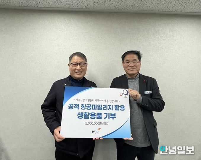 안녕일보 배윤 기자 | 파주시는 지난 24일 '2025년 공적 항공 이용 실적 점수(마일리지) 기부물품 전달식’을 열고, 공무 출장으로 발생한 항공 이용 실적 점수(마일리지)를 활용해 마련한 생활용품 385점(27개 품목)을 희망나눔푸드마켓에 전달했다고 밝혔다.