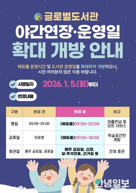 또한, 글로벌도서관은 기존 공휴일에 운영되지 않던 에듀룸 학습공간을 오전 9시부터 오후 6시까지 개방해 학생과 시민들의 안정적인 학습 활동을 지원할 계획이다.