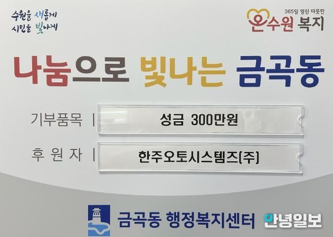 안녕일보 배윤 기자 | 지난 29일 수원시 권선구 금곡동 행정복지센터는 한주오토시스템즈(주)로부터 저소득 가정을 지원하기 위한 성금 300만 원을 전달받았다고 밝혔다.