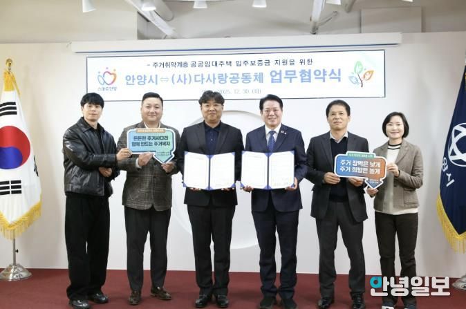 안녕일보 배윤 기자 | 안양시는 30일 오전 10시 시청 3층 접견실에서 (사)다사랑공동체와 ‘주거취약계층 공공임대주택 입주보증금 지원을 위한 업무협약’을 체결했다.