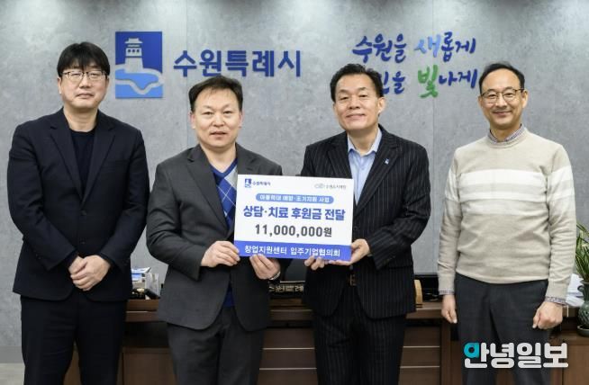안녕일보 배윤 기자 | 수원시 창업지원센터 입주기업협의회가 “학대 피해아동 지원에 사용해 달라”며 수원시에 후원금 1100만 원을 전달했다. 전달식은 30일 이재준 수원시장 집무실에서 열렸다.
