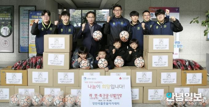 안녕일보 배윤 기자 | 수원시 장안구는 장안리틀풋볼아카데미가 지난 30일 장안구청에 라면 25상자와 축구공 20개 기부했다고 밝혔다. 이번 기부는 아카데미 회원들이 십시일반으로 정성을 모아 마련한 것으로, 장안구 관내 어려운 이웃들에게 전달될 예정이다.