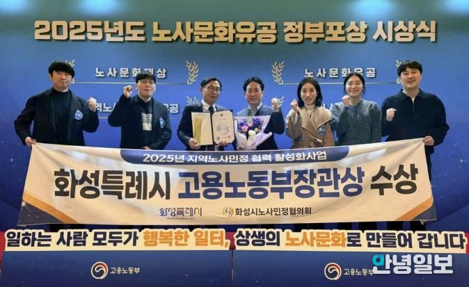 안녕일보 배윤 기자 | 화성특례시는 지난 30일 고용노동부 주관으로 열린 '2025년 노사문화유공 정부포상 시상식’에서 ‘지역노사민정 협력 유공’단체부문 고용노동부장관 표창을 수상했다고 31일 밝혔다.