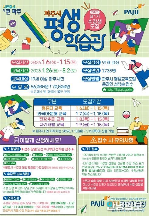 안녕일보 배윤 기자 | 파주시는 시민의 평생학습 기회를 확대하기 위해 파주시 평생학습관 2026년 제1기 수강생을 오는 15일까지 모집한다고 밝혔다.