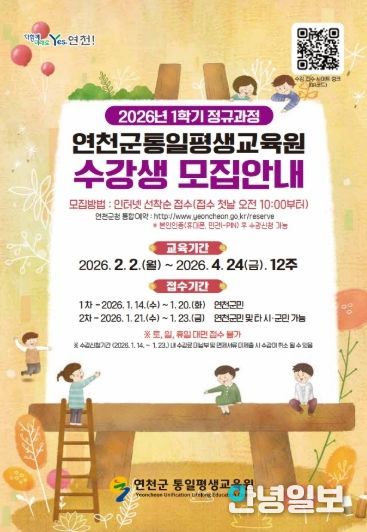 안녕일보 배윤 기자 | 연천군은 군민의 평생학습 참여 기회를 확대하기 위해 2026년 1학기 평생교육 정규과정 수강생을 모집한다고 밝혔다.