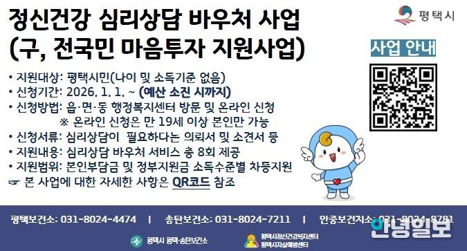 안녕일보 배윤 기자 | 평택시에서는 시민의 마음 건강을 지키고 자살 예방 및 정신질환 조기 발견을 돕기 위한 ‘정신건강 심리상담 바우처사업’을 2026년에도 계속 추진한다.