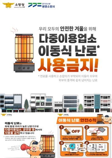이에 광명소방서는 화재 저감을 위해 이동식 난로 및 온열기구 사용 시 ▲난로 주위 인화성 물질 제거 ▲전도·과열 시 전원이 차단되는 안전장치가 있는 제품 사용 ▲난로 사용 중 주유 금지 등 안전 수칙을 강조했다.