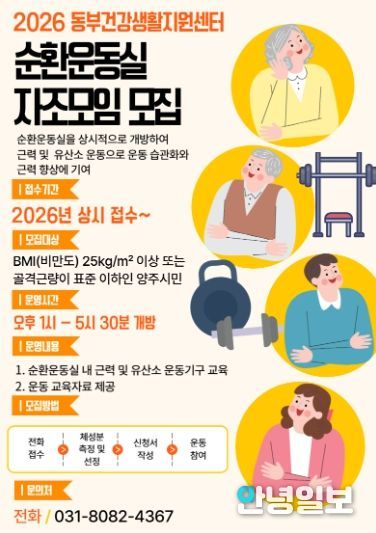 안녕일보 배윤 기자 | 양주시 보건소 동부건강생활지원센터가 지역주민의 신체활동 참여를 활성화하고 건강한 생활 습관 형성을 위해 ‘2026년도 순환운동실 자조모임’ 참가자를 연중 수시로 모집한다.
