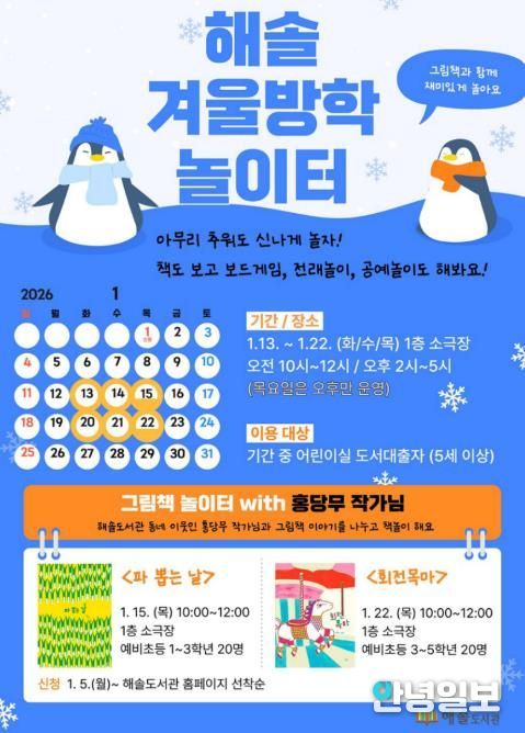 안녕일보 배윤 기자 | 파주시 해솔도서관은 겨울방학을 맞이한 어린이들이 한파에도 안전하게 놀 수 있는 ‘해솔 겨울방학 놀이터’를 운영한다.