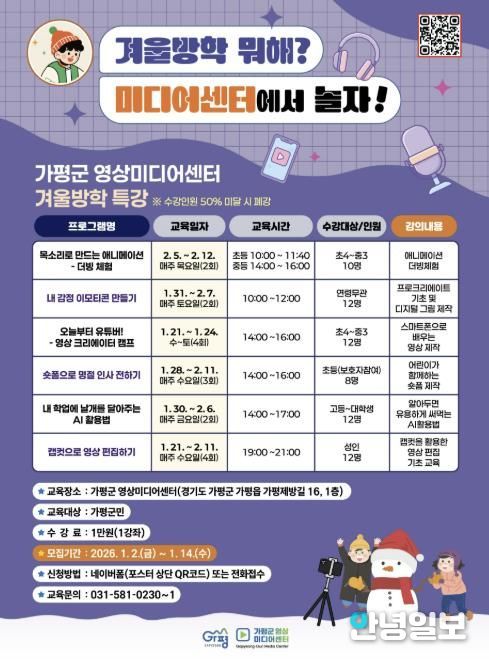 가평군 영상미디어센터는 겨울방학 기간을 활용해 애니메이션, 영상 제작, AI 활용 등 다양한 주제의 ‘겨울방학 특강 프로그램’을 운영한다. 방학을 단순한 휴식이 아닌 배움의 시간으로 채우자는 취지에서 기획된 프로그램이다. 수강료는 1강좌당 1만원이며, 모집 기간은 1월 2일부터 14일까지다.