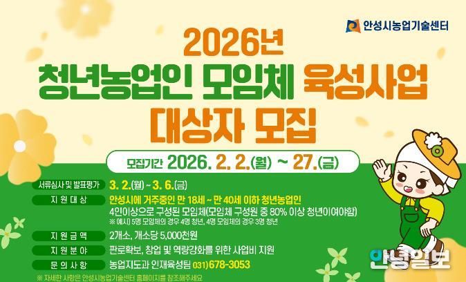 안녕일보 배윤 기자 | 안성시는 오는 2월 2일부터 27일까지 ‘청년농업인 모임체 육성사업’ 대상자를 모집한다.