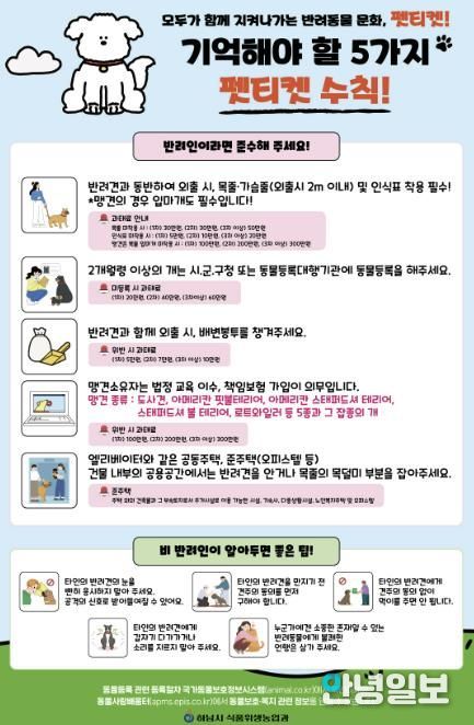 홍보물에는 ▲외출 시 목줄·가슴줄(2m 이내) 및 인식표 착용 ▲2개월령 이상 반려견의 동물등록 ▲배변 봉투 지참 ▲맹견 소유자의 법정 교육 이수 ▲엘리베이터 내 반려동물 안기 등 '기억해야 할 5가지 펫티켓'이 담겼다. 비반려인을 위해서도 타인의 반려견을 응시하거나 동의 없이 만지지 않기 등의 에티켓을 함께 안내해 주민 간 갈등 예방에 힘쓰고 있다.