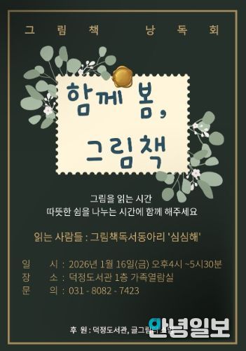 안녕일보 배윤 기자 | 양주시 덕정도서관은 오는 1월 16일 16시부터 17시 30분까지, 도서관 1층 가족열람실에서 그림책 낭독회 '함께 봄, 그림책'을 운영한다.