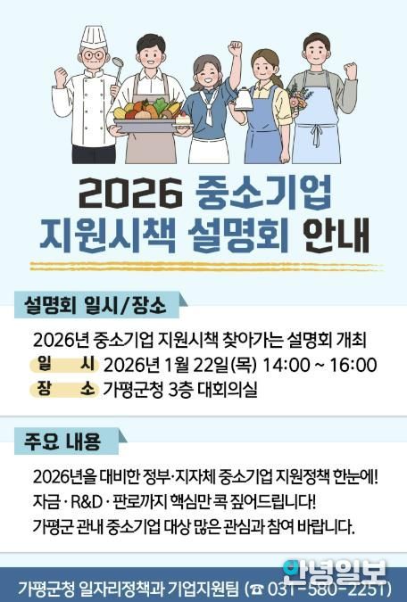 가평군은 관내 중소기업을 대상으로 ‘2026년 중소기업 지원시책 설명회’를 오는 22일 오후 2시 가평군청 3층 대회의실에서 개최한다고 밝혔다. 이번 설명회는 2026년도 중소기업 지원정책을 종합적으로 소개하는 한편 기업 현장의 애로사항을 직접 청취해 정책 수요에 반영하기 위해 마련됐다. 설명회에는 중소벤처기업진흥공단, 기술보증기금, 소상공인진흥공단, 경기중소벤처기업청 등 10개 기관이 참여한다.