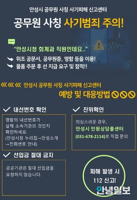 안성시 관계자는 “안성시 공무원은 어떠한 경우에도 선입금을 요구하지 않는다”며 “수상하거나 의심스러운 연락을 받았을 경우, 즉시 신고센터로 문의해 달라”고 당부했다.