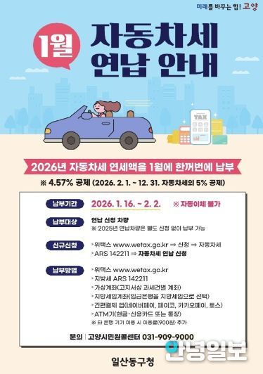안녕일보 배윤 기자 | 고양특례시 일산동구 세무과는 1월에 자동차세를 연납하면 1년 세액의 약 4.5%를 공제받을 수 있는 연납 신청기간을 1월 한 달간 운영한다고 밝혔다.