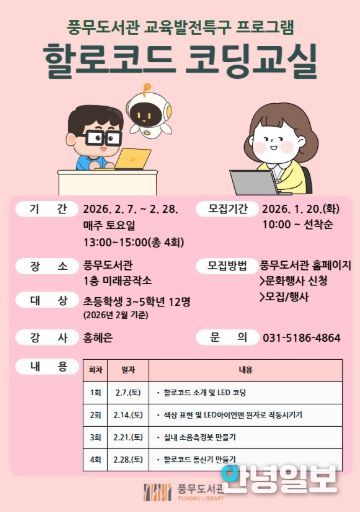 안녕일보 배윤 기자 | 김포시 풍무도서관에서는 초등학생 3~5학년을 대상으로 ‘할로코드 코딩교실’을 오는 2월 7일부터 2월 28일까지 매주 토요일 오후 1시부터 3시까지 총 4회에 걸쳐 운영한다.