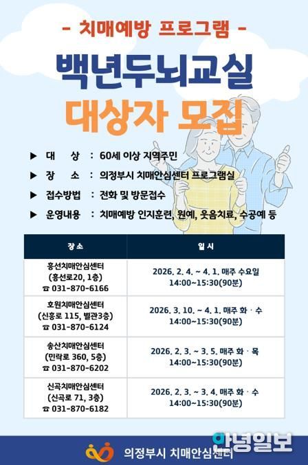 안녕일보 배윤 기자 | 의정부시 보건소 치매안심센터는 치매 예방과 인지기능 유지‧향상을 위한 2026년 상반기 치매예방 프로그램 ‘백년두뇌교실 1기’를 운영한다.