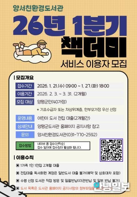 안녕일보 배윤 기자 | 양평군은 오는 21일부터 27일까지 2026년 1분기 어린이 전집 대출 서비스인 ‘책더미’ 이용자를 모집한다고 밝혔다.