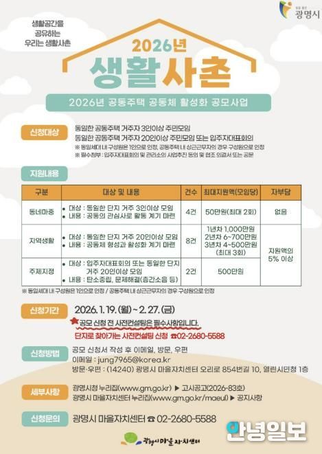 시는 공동주택 이웃 간 관계 회복과 생활권 중심 공동체 문화 확산을 위해 ‘2026년 광명시 생활사촌 공동주택 공동체 활성화 공모사업’ 참여자를 오는 2월 27일까지 모집한다.