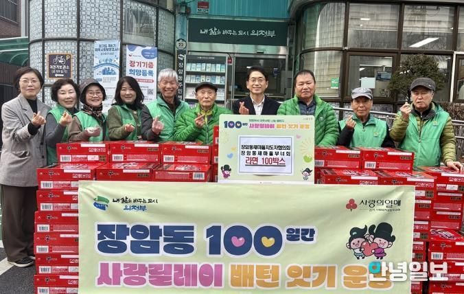 안녕일보 배윤 기자 | 의정부시 장암동주민센터는 1월 15일 장암동 새마을지도자협의회·새마을부녀회가 겨울철 어려운 이웃들을 위해 라면 100상자를 전달하며 ‘100일간 사랑릴레이 배턴 잇기’에 동참했다고 밝혔다.