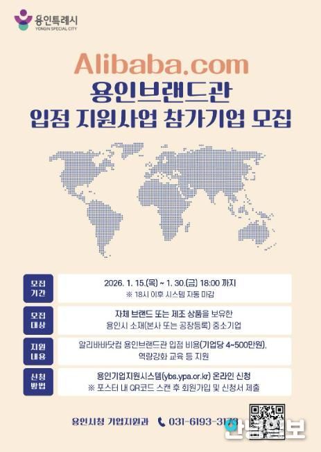 안녕일보 배윤 기자 | 용인특례시는 오는 1월 30일까지 B2B(기업 간 거래) 플랫폼 알리바바닷컴 내 ‘용인브랜드관’(YoGo) 입점 참가기업을 모집한다고 20일 밝혔다.