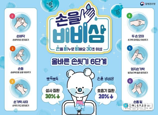올바른 손 씻기는 감염병 예방을 위한 가장 쉽고 효과적인 방법으로, 흐르는 물에 비누로 30초 이상 손을 씻으면 최근 유행 중인 인플루엔자와 노로바이러스 등 장관감염증과 호흡기 감염병 예방에 큰 효과가 있다.