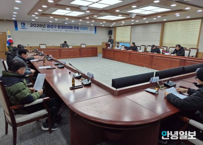 안녕일보 배윤 기자 | 권선구 환경위생과는 최일선에서 일하는 환경관리원들을 격려하고 애로사항을 청취하고자 ‘환경관리원 간담회’를 2026년 1월 21일 오전 11시에 개최했다.