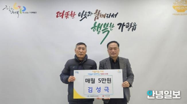 안녕일보 배윤 기자 | 가평군 가평읍 주민 김성극 씨가 취약계층 이웃돕기 성금으로 매월 5만 원을 가평읍 행정복지센터에 정기기탁하기로 했다.