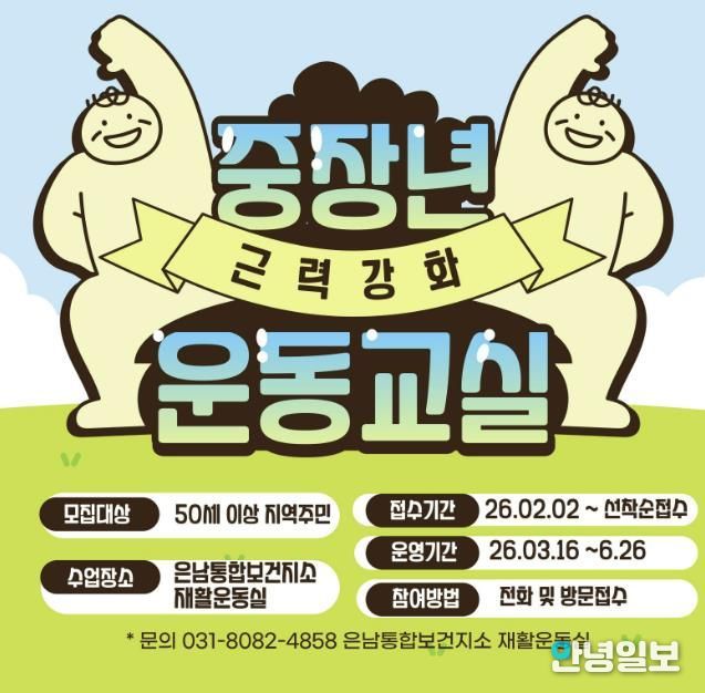 모집 대상은 양주시에 거주하는 50세 이상 남녀로, 은현면과 남면 거주자는 우선 선발된다. 신청은 2월 2일부터 선착순으로 접수하며, 신청 및 문의는 은남통합보건지소 재활운동실로 하면 된다.