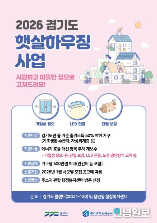 안녕일보 배윤 기자 | 경기도가 난방비 및 전기료 등 주거비 부담을 덜어주기 위해 2026년 햇살하우징 사업을 추진한다.