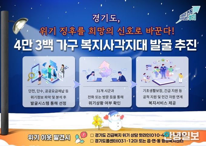 안녕일보 배윤 기자 | 경기도가 1월부터 3월까지 가스요금체납 등 위기 정보가 발견된 도내 4만 3백 명을 대상으로 복지사각지대 발굴에 나선다. 도는 빅데이터를 통해 예측한 위기가구가 실제 위기에 처했는지 확인하고 필요한 지원을 할 계획이다.