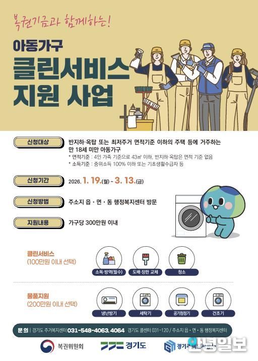 안녕일보 배윤 기자 | 안성시는 복권기금과 함께하는 경기도 ‘아동가구 클린서비스 지원사업’ 신청을 1월 26일부터 3월 13일까지 받는다.
