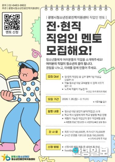 안녕일보 배윤 기자 | 광명시청소년재단 청소년진로진학지원센터는 관내 청소년들에게 현실적인 직업 정보와 체계적인 진로 설계 기회를 제공하기 위해 ‘2026년 직업인 멘토’를 신규 모집한다고 밝혔다.
