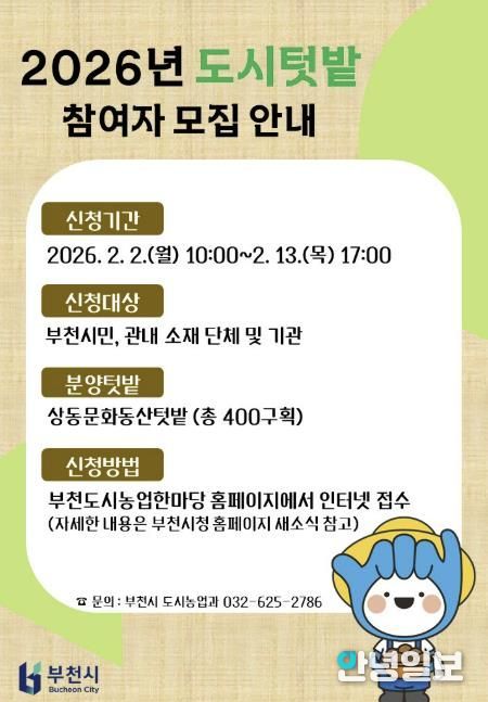 안녕일보 배윤 기자 | 부천시는 시민들이 텃밭 가꾸기를 통해 농업을 체험하고 자연과 공존하는 도시환경을 조성할 수 있도록 ‘2026년 도시텃밭’ 참여자를 모집한다.