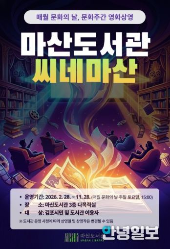 안녕일보 배윤 기자 | 김포시 마산도서관은 매월 문화의 날을 맞아 시민들이 일상 속으로 자연스럽게 문화를 향유 할 수 있도록 문화 주간 영화 상영 프로그램 ‘씨네마산’을 운영한다.