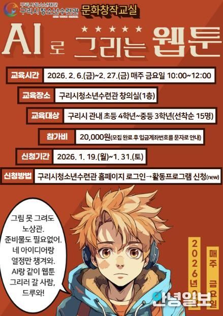 안녕일보 배윤 기자 | 구리시청소년재단 청소년수련관은 겨울방학을 맞아 2월 6일부터 27일까지 매주 금요일 문화 창작 교실 'AI로 그리는 웹툰' 프로그램을 운영한다. 이번 프로그램은 초등학교 4학년부터 중학생을 대상으로 매회 오전 10시부터 12시까지 총 4주간 진행된다.