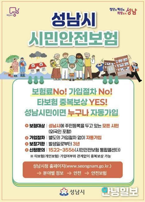 이번 보장 확대에 따라 시민안전보험 보장항목은 기존 12개에서 14개로 늘어났다. 성남시에 주민등록을 둔 시민이라면 외국인을 포함해 별도 가입 절차 없이 자동 가입되며, 개인보험과 중복 적용도 가능하다.
